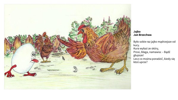 Jajko Jan Brzechwa Było sobie raz jajko mądrzejsze od kury. Kura wyłazi ze skóry, Prosi, błaga, namawia: – Bądź głupsze! Lecz co można poradzić, kiedy się ktoś uprze?