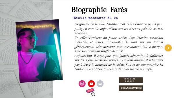 Originaire de la ville d’Antibes (06), Farès s'affirme peu à peu puisqu’il cumule aujourd’hui sur les réseaux près de 45 000 abonnés. En effet, l’univers du jeune artiste Pop Urbaine associant mélodies et lyrics universelles, le tout sur un format généralement très dansant, s'est recemment fait remarqué avec son nouveau single "Médina".Aujourd’hui, il reste plus que jamais déterminé à s’affirmer sur lla scène musicale français au sein duquel il n’hésitera pas à lever le drapeau de la scène Sud et de son quartier La Fontonne à Antibes. tout en restant lui même et simple.