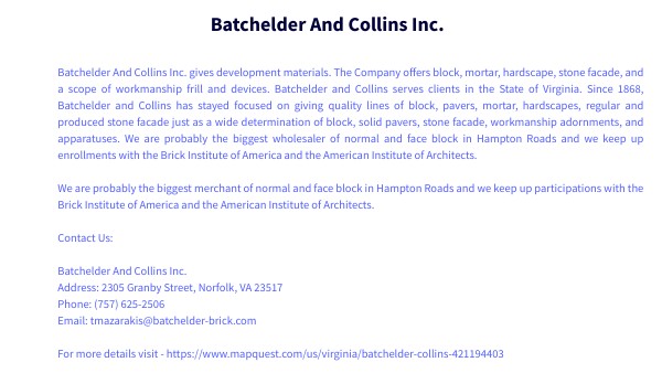 Batchelder And Collins Inc. gives development materials. The Company offers block, mortar, hardscape, stone facade, and a scope of workmanship frill and devices. Batchelder and Collins serves clients in the State of Virginia. Since 1868, Batchelder and Collins has stayed focused on giving quality lines of block, pavers, mortar, hardscapes, regular and produced stone facade just as a wide determination of block, solid pavers, stone facade, workmanship adornments, and apparatuses. We are probably the biggest wholesaler of normal and face block in Hampton Roads and we keep up enrollments with the Brick Institute of America and the American Institute of Architects. We are probably the biggest merchant of normal and face block in Hampton Roads and we keep up participations with the Brick Institute of America and the American Institute of Architects. Contact Us: Batchelder And Collins Inc. Address: 2305 Granby Street, Norfolk, VA 23517 Phone: (757) 625-2506 Email: tmazarakis@batchelder-brick.com For more details visit - https://www.mapquest.com/us/virginia/batchelder-collins-421194403