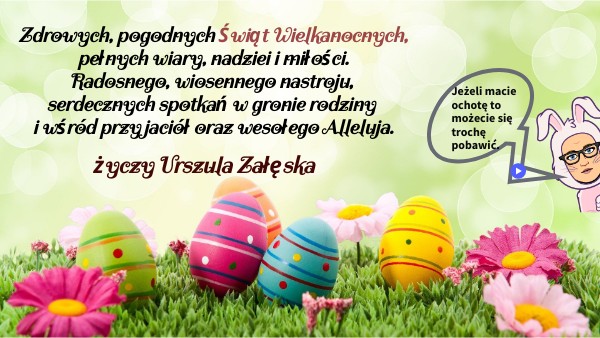Zdrowych, pogodnych Świąt Wielkanocnych, pełnych wiary, nadziei i miłości. Radosnego, wiosennego nastroju, serdecznych spotkań w gronie rodziny i wśród przyjaciół oraz wesołego Alleluja.