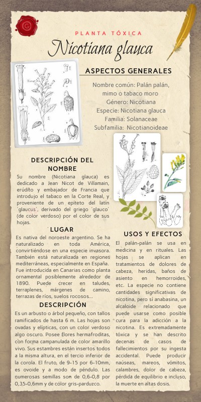 Nombre común: Palán palán, mimo o tabaco moro Género: NicotianaEspecie: Nicotiana glauca Familia: Solanaceae Subfamilia: Nicotianoideae