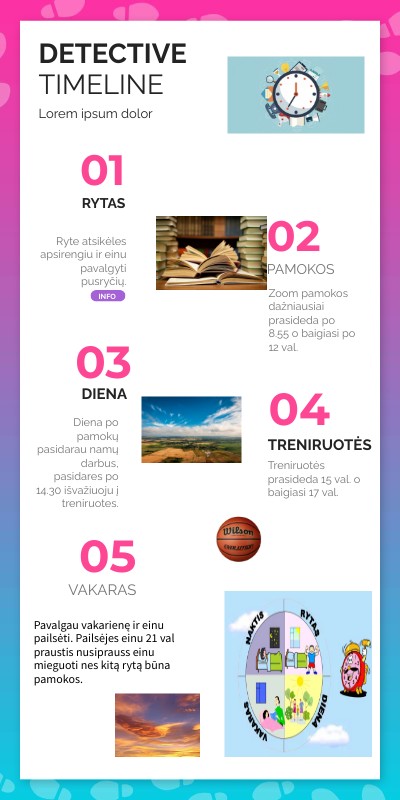 Diena po pamokų pasidarau namų darbus, pasidares po 14.30 išvažiuoju į treniruotes.