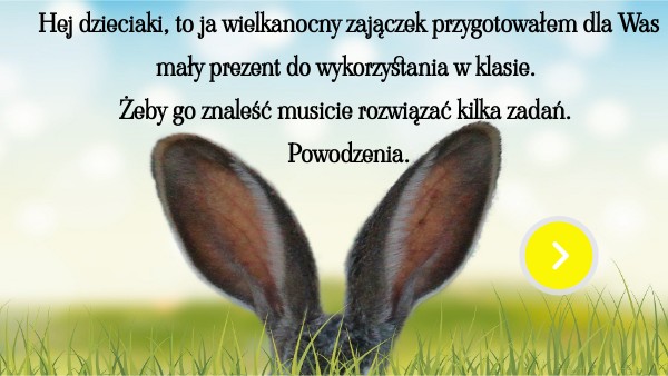 Hej dzieciaki, to ja wielkanocny zajączek przygotowałem dla Was mały prezent do wykorzystania w klasie. Żeby go znaleść musicie rozwiązać kilka zadań. Powodzenia.