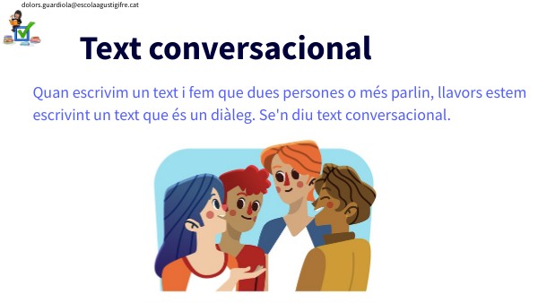 Quan escrivim un text i fem que dues persones o més parlin, llavors estem escrivint un text que és un diàleg. Se'n diu text conversacional.