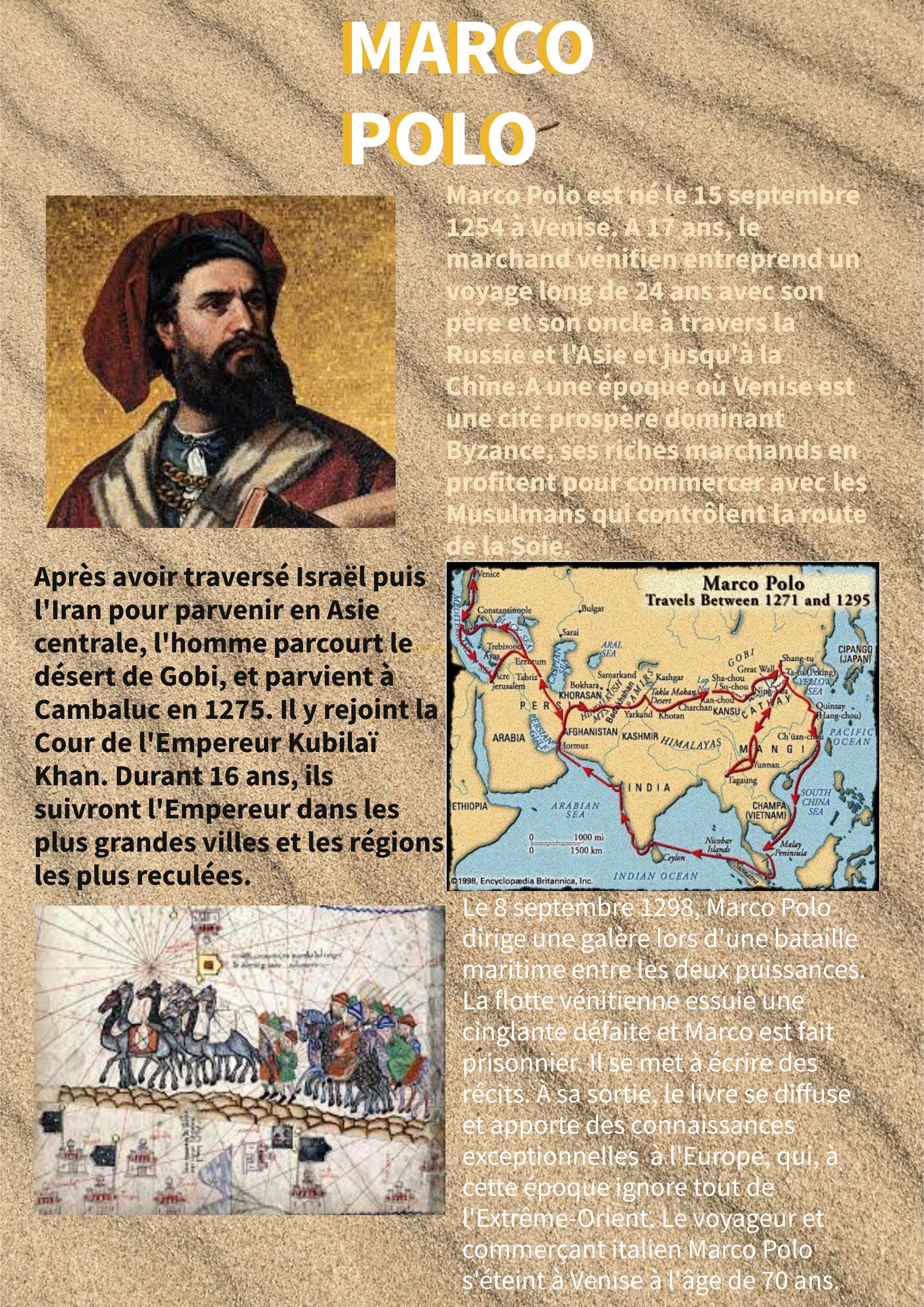 Le 8 septembre 1298, Marco Polo dirige une galère lors d'une bataille maritime entre les deux puissances. La flotte vénitienne essuie une cinglante défaite et Marco est fait prisonnier. Il se met à écrire des récits. À sa sortie, le livre se diffuse et apporte des connaissances exceptionnelles à l'Europe, qui, à cette époque ignore tout de l'Extrême-Orient. Le voyageur et commerçant italien Marco Polo s'éteint à Venise à l'âge de 70 ans.