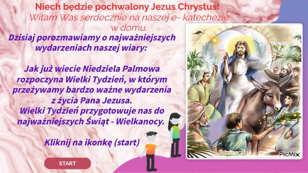 Dzisiaj porozmawiamy o najważniejszych wydarzeniach naszej wiary: Jak już wiecie Niedziela Palmowa rozpoczyna Wielki Tydzień, w którym przeżywamy bardzo ważne wydarzenia z życia Pana Jezusa. Wielki Tydzień przygotowuje nas do najważniejszych Świąt - Wielkanocy. Kliknij na ikonkę (start)