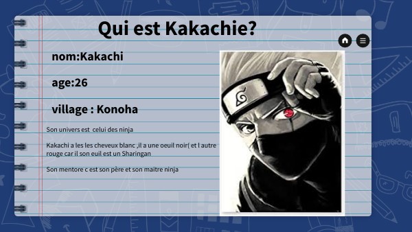 Son univers est celui des ninja Kakachi a les les cheveux blanc ,il a une oeuil noir( et l autre rouge car il son euil est un Sharingan Son mentore c est son père et son maitre ninja