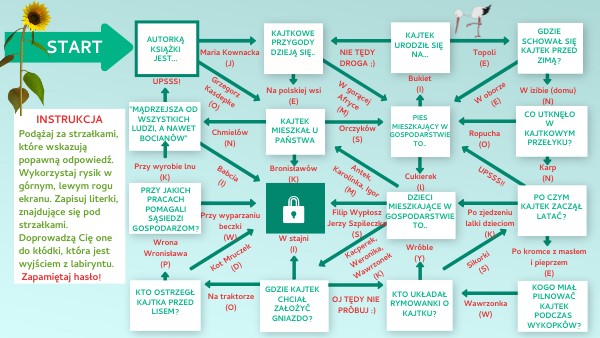 Podążaj za strzałkami, które wskazują popawną odpowiedź. Wykorzystaj rysik w górnym, lewym rogu ekranu. Zapisuj literki, znajdujące się pod strzałkami. Doprowadzą Cię one do kłódki, która jest wyjściem z labiryntu. Zapamiętaj hasło!
