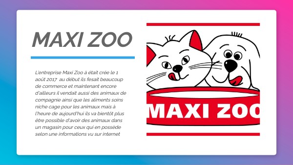 L'entreprise Maxi Zoo à était crée le 1 août 2017 au début ils fesait beaucoup de commerce et maintenant encore d'ailleurs il vendait aussi des animaux de compagnie ainsi que les aliments soins niche cage pour les animaux mais à l'heure de aujourd'hui ils va bientôt plus être possible d'avoir des animaux dans un magasin pour ceux qui en possède selon une informations vu sur internet