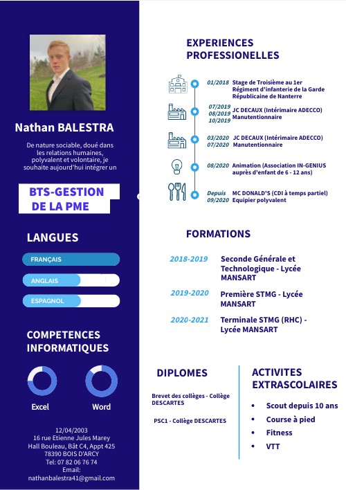 12/04/2003 16 rue Etienne Jules Marey Hall Bouleau, Bât C4, Appt 425 78390 BOIS D'ARCY Tel: 07 82 06 76 74 Email: nathanbalestra41@gmail.com