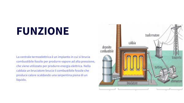 La centrale termoelettrica è un impianto in cui si brucia combustibile fossile per produrre vapore ad alta pressione, che viene utilizzato per produrre energia elettrica. Nella caldaia un bruciatore brucia il combustibile fossile che produce calore scaldando una serpentina piena di un liquido.