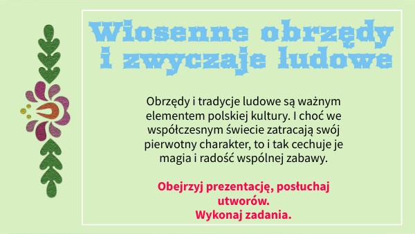 Obrzędy i tradycje ludowe są ważnym elementem polskiej kultury. I choć we współczesnym świecie zatracają swój pierwotny charakter, to i tak cechuje je magia i radość wspólnej zabawy.Obejrzyj prezentację, posłuchaj utworów. Wykonaj zadania.