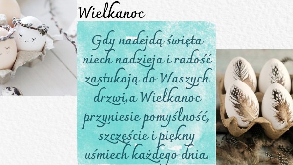 Gdy nadejdą święta niech nadzieja i radość zastukają do Waszych drzwi,a Wielkanoc przyniesie pomyślność, szczęście i piękny uśmiech każdego dnia.