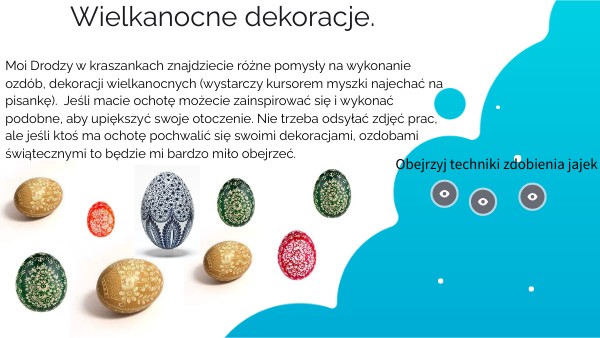 Moi Drodzy w kraszankach znajdziecie różne pomysły na wykonanie ozdób, dekoracji wielkanocnych (wystarczy kursorem myszki najechać na pisankę). Jeśli macie ochotę możecie zainspirować się i wykonać podobne, aby upiększyć swoje otoczenie. Nie trzeba odsyłać zdjęć prac, ale jeśli ktoś ma ochotę pochwalić się swoimi dekoracjami, ozdobami świątecznymi to będzie mi bardzo miło obejrzeć.