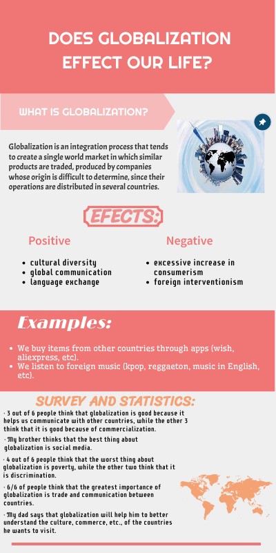 · 3 out of 6 people think that globalization is good because it helps us communicate with other countries, while the other 3 think that it is good because of commercialization.