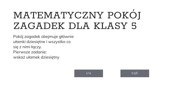 Pokój zagadek obejmuje głównie ułamki dziesiętne i wszystko co się z nimi łączy. Pierwsze zadanie: wskaż ułamek dziesiętny