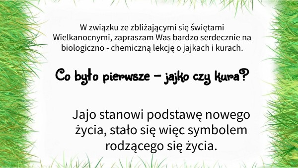 W związku ze zbliżającymi się świętami Wielkanocnymi, zapraszam Was bardzo serdecznie na biologiczno - chemiczną lekcję o jajkach i kurach.
