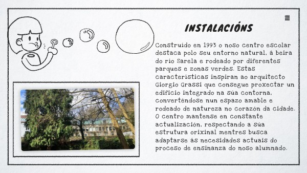 Construído en 1993 o noso centro escolar destaca polo seu entorno natural, á beira do río Sarela e rodeado por diferentes parques e zonas verdes. Estas características inspiran ao arquitecto Giorgio Grassi que consegue proxectar un edificio integrado na súa contorna, converténdose nun espazo amable e rodeado de natureza no corazón da cidade.