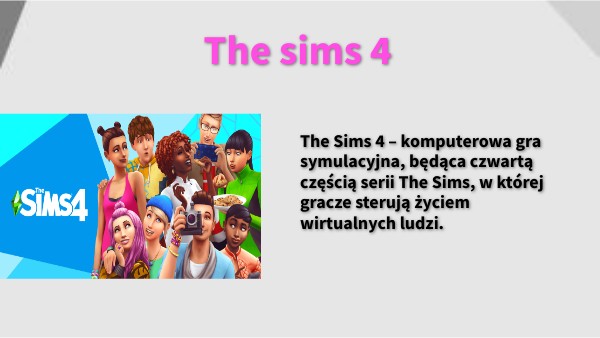 The Sims 4 – komputerowa gra symulacyjna, będąca czwartą częścią serii The Sims, w której gracze sterują życiem wirtualnych ludzi.
