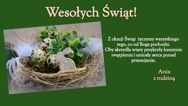 Pełnych spokoju i radościŚwiąt Wielkanocnych, wypoczynku w rodzinnym gronie oraz optymizmu, energii i nadziei na lepszą przyszłość