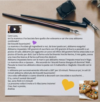 Caro Luca, ieri la mamma ci ha lasciato fare quello che volevamo e sai che cosa abbiamo combinato? Dei biscotti buonissimi! La mamma ci ha dato gli ingredienti e noi, da bravi pasticceri, abbiamo eseguito! Abbiamo impastato 100 grammi di zucchero con 150 grammi di burro a pezzetti e un pizzico di sale; abbiamo poi aggiunto un uovo ed infine 300 grammi farina setacciata e un pizzico di lievito per dolci (sai la farina vola facilmente! Anche Nerino, il mio gatto, aveva una macchia bianca di farina sull’orecchio destro!). Abbiamo impastato bene con le mani e poi abbiamo messo l’impasto mezz’ora in frigo. La mamma dice a riposare… Ma secondo te i biscotti hanno bisogno di dormire? Mah… Passata la mezz’ora abbiamo steso la pasta con il mattarello e ritagliato i biscotti con le formine. Li abbiamo poi successivamente infornati a 180° per 10 minuti. Pensa un po’, in soli 10 minuti abbiamo ottenuto dei biscotti buonissimi! Una volta raffreddati ci siamo divertiti a decorarli con cioccolato e zuccherini… E tu, come li avresti decorati? Sai, sono finiti in 5 minuti! La prossima volta ti invito e li rifacciamo insieme! Ciao, baci a presto, Andrea