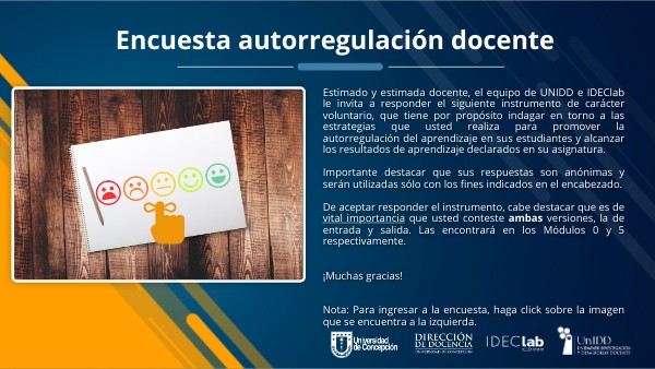 Estimado y estimada docente, el equipo de UNIDD e IDEClab le invita a responder el siguiente instrumento de carácter voluntario, que tiene por propósito indagar en torno a las estrategias que usted realiza para promover la autorregulación del aprendizaje en sus estudiantes y alcanzar los resultados de aprendizaje declarados en su asignatura. Importante destacar que sus respuestas son anónimas y serán utilizadas sólo con los fines indicados en el encabezado. De aceptar responder el instrumento, cabe destacar que es de vital importancia que usted conteste ambas versiones, la de entrada y salida. Las encontrará en los Módulos 0 y 5 respectivamente. ¡Muchas gracias! Nota: Para ingresar a la encuesta, haga click sobre la imagen que se encuentra a la izquierda.