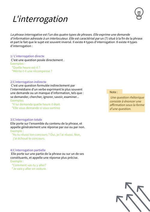 1/ L'interrogation directe C'est une question posée directement . Exemples : *Quelle heure est-il ? *Mérite-t-il une récompense ?