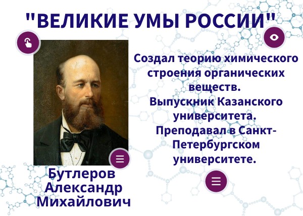 Создал теорию химического строения органических веществ. Выпускник Казанского университета. Преподавал в Санкт-Петербургском университете.