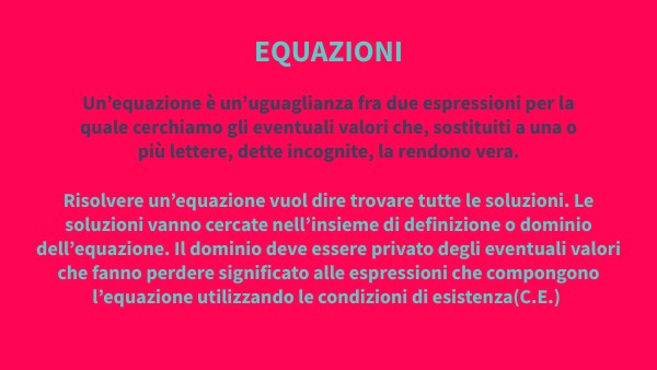 Un’equazione è un’uguaglianza fra due espressioni per la quale cerchiamo gli eventuali valori che, sostituiti a una o più lettere, dette incognite, la rendono vera.
