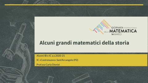 In occasione della giornata internazionale della Matematica 2021 gli alunni delle classi IB e IC della scuola secondaria dell’I.C. «Castronuovo» hanno approfondito la conoscenza dei grandi matematici della storia. Alcuni nomi erano loro più familiari (Euclide, Pitagora, Newton, Cartesio, Fibonacci) perché li avevano già incontrati nel corso dei loro studi, altri invece hanno imparato a conoscerli in questa occasione. Volutamente le schede bibliografiche non seguono un ordine cronologico e si concludono con la figura di Albert Einstein di cui si celebra l’anniversario della nascita proprio il 14 marzo, giornata del pi greco prima, e oggi «Giornata Internazionale della Matematica».