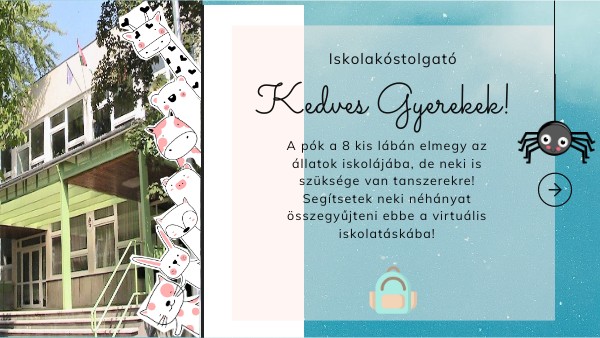 A pók a 8 kis lábán elmegy az állatok iskolájába, de neki is szüksége van tanszerekre! Segítsetek neki néhányat összegyűjteni ebbe a virtuális iskolatáskába!