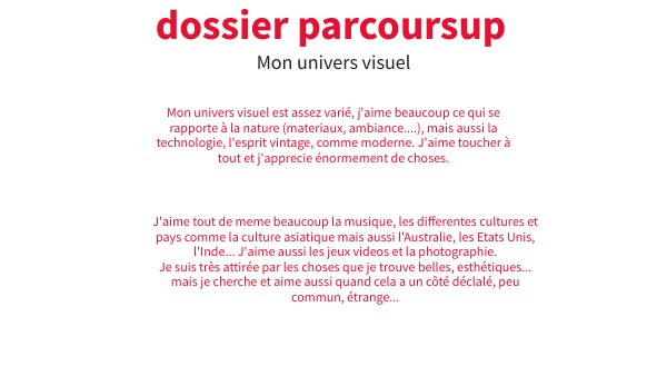 J'aime tout de meme beaucoup la musique, les differentes cultures et pays comme la culture asiatique mais aussi l'Australie, les Etats Unis, l'Inde... J'aime aussi les jeux videos et la photographie. Je suis très attirée par les choses que je trouve belles, esthétiques... mais je cherche et aime aussi quand cela a un côté déclalé, peu commun, étrange...