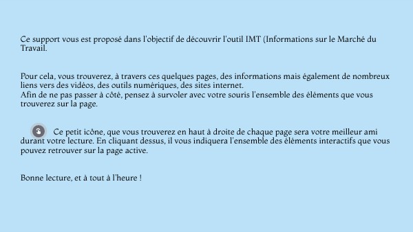 Ce support vous est proposé dans l'objectif de découvrir l'outil IMT (Informations sur le Marché du Travail. Pour cela, vous trouverez, à travers ces quelques pages, des informations mais également de nombreux liens vers des vidéos, des outils numériques, des sites internet. Afin de ne pas passer à côté, pensez à survoler avec votre souris l'ensemble des éléments que vous trouverez sur la page. Ce petit icône, que vous trouverez en haut à droite de chaque page sera votre meilleur ami durant votre lecture. En cliquant dessus, il vous indiquera l'ensemble des éléments interactifs que vous pouvez retrouver sur la page active. Bonne lecture, et à tout à l'heure !