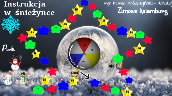 Kalambury to gra grupowa.Wybieracie pionka- jednego z motylków, możecie się nim poruszać po całej planszy Grę zaczyna grupa graczy, która wylosuje najwyższą liczbę na kostce. Następnie gracze poruszają się według kierunku wskazówek zegara, Gracz rzuca kostką, odlicza tyle pól ile wskazuje wylosowana liczba. Przesuwa tam swojego motylka. Każdy kolor pola, oznacza inną czynność. Pierwsza osoba z grupy czyta polecenie, reszta grupy odwraca si,e Po przeczytaniu polecenia osoba prezentująca musi zgodnie z poleceniem zrobić wszytsko, aby grupa zgadła. Można ustawić stoper i umówić się np, na 2 minuty. Hasła związane są z wiosną Wygrywa ta grupa, która jako pierwsza przejdzie planszę.