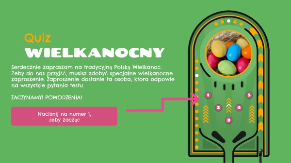 Serdecznie zapraszam na tradycyjną Polską Wielkanoc.Żeby do nas przyjść, musisz zdobyć specjalne wielkanocne zaproszenie. Zaproszenie dostanie ta osoba, która odpowie na wszystkie pytania testu. ZACZYNAMY! POWODZENIA!