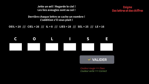 Jette un œil ! Regarde le ciel ! Les lies aveugles sont au sol ! Derrière chaque lettre se cache un nombre !L'addition s'il vous plait ! OEIL = 20 /// CIEL = 26 /// IL = 8 /// LIES = 28 /// SEL = 25 /// LE = 16