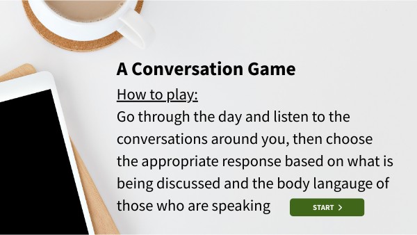 How to play:Go through the day and listen to the conversations around you, then choose the appropriate response based on what is being discussed and the body langauge of those who are speaking