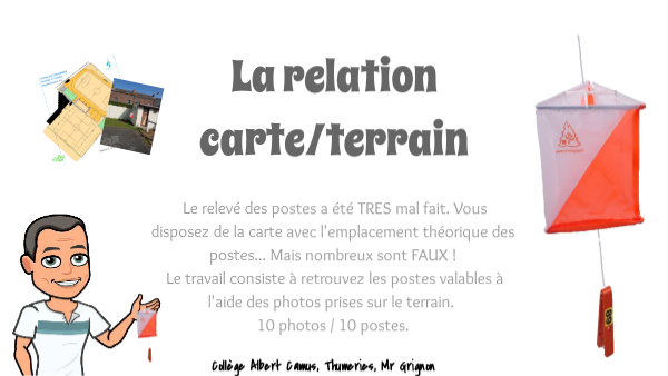 Le relevé des postes a été TRES mal fait. Vous disposez de la carte avec l'emplacement théorique des postes... Mais nombreux sont FAUX ! Le travail consiste à retrouvez les postes valables à l'aide des photos prises sur le terrain. 10 photos / 10 postes.