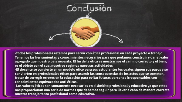 -Todos los profesionales estamos para servir con ética profesional en cada proyecto o trabajo. Tenemos las herramientas y conocimientos necesarios para que podamos construir y dar el valor agregado que nuestro país necesita. El fin de la ética es mostrarnos el camino correcto y el bien, es el objeto con el cual nosotros regimos nuestras actividades -El docente se convierte en un modelo ético para sus estudiantes los cuales siguen sus pasos y se convierten en profesionales éticos para asumir las consecuencias de los actos que se cometen, tratar de corregir errores en la educación para evitar futuras personas irresponsables con conocimientos equivocados anti éticos. -Los valores éticos son sumamente necesarios en el ámbito profesional y educativo ya que estos nos proporcionan una serie de normas que debemos seguir para llevar a cabo de manera correcta nuestro trabajo tanto profesional como educativo.