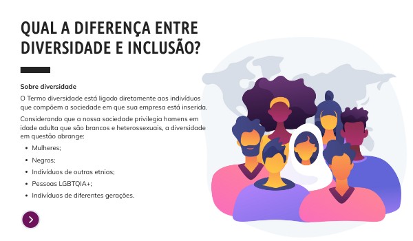 Sobre inclusão A inclusão é o próximo nível desse processo. Após se conscientizar da diversidade que existe na sociedade e inseri-las em sua empresa, agora é preciso garantir uma cultura organizacional que faça com que essas pessoas tenham as mesmas chances de desenvolvimento e promoção que todos os colaboradores possuem. Comece analisando sua empresa de cima para baixo: