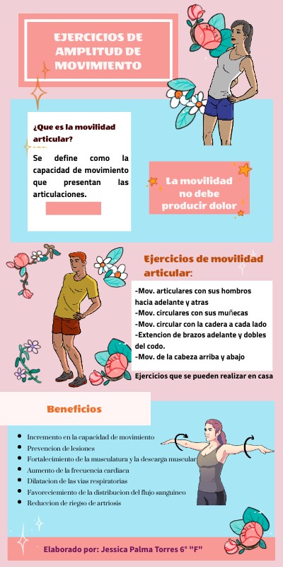 -Mov. articulares con sus hombros hacia adelante y atras-Mov. circulares con sus muñecas -Mov. circular con la cadera a cada lado -Extencion de brazos adelante y dobles del codo. -Mov. de la cabeza arriba y abajo