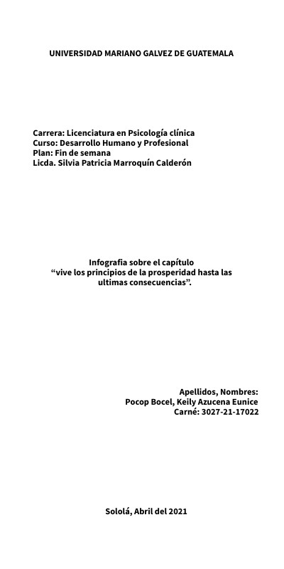 UNIVERSIDAD MARIANO GALVEZ DE GUATEMALA Carrera: Licenciatura en Psicología clínica Curso: Desarrollo Humano y Profesional Plan: Fin de semana Licda. Silvia Patricia Marroquín Calderón Infografia sobre el capítulo “vive los principios de la prosperidad hasta las ultimas consecuencias”. Apellidos, Nombres: Pocop Bocel, Keily Azucena Eunice Carné: 3027-21-17022 Sololá, Abril del 2021