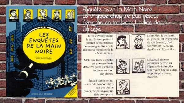 Enquête avec la Main Noire. Lis chaque chapitre puis résous l'énigme en trouvant l'indice dans l'image.