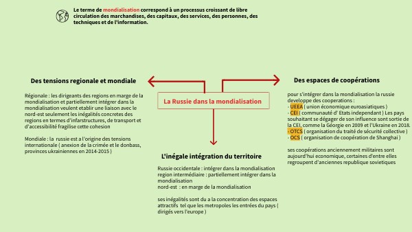 pour s'intégrer dans la mondialisation la russie developpe des cooperations : - UEEA ( union économique euroasiatiques ) - CEI ( communauté d' Etats independant ) Les pays souhaitant se dégager de son influence sont sortie de la CEI, comme la Géorgie en 2009 et l'Ukraine en 2018. - OTCS ( organisation du traité de sécurité collective ) - OCS ( organisation de coopération de Shanghai ) ses coopérations anciennement militaires sont aujourd'hui economique, certaines d'entre elles regroupent d'anciennes republique sovietiques
