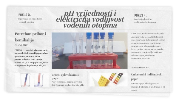 Samo ispitivanje električne vodljivosti vodenih otopina je bilo lakše ali i zanimljivije od ispitivanja pH vrijednosti, stoga mi se POKUS 4. više dopao negoli POKUS 3.