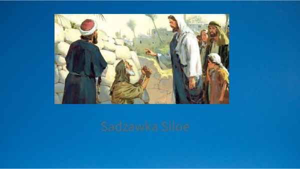 Źródła: Komentarz historyczno - kulturowy do Nowego Testamentu Craig S. Keener Biblia Pierwszego Kościoła Vocatio Francisco F. Carvajal "Rozmowy z Bogiem. Medytacje na każdy dzień." Francisco F. Carvajal " Życie Jezusa według Ewangelii" Ilustracja 1 http://rodzinarodzin.pl/index.php/181028-ewangelia-30nzb/ Ilustracja 2 https://www.istockphoto.com/pl/obrazy/sadzawka-siloe
