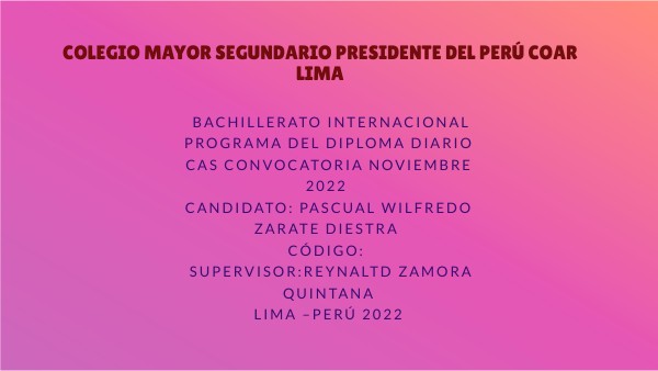 BACHILLERATO INTERNACIONAL PROGRAMA DEL DIPLOMA DIARIO CAS CONVOCATORIA NOVIEMBRE 2022 Candidato: Pascual Wilfredo Zarate Diestra Código: Supervisor:REYNALTD ZAMORA QUINTANA Lima –Perú 2022