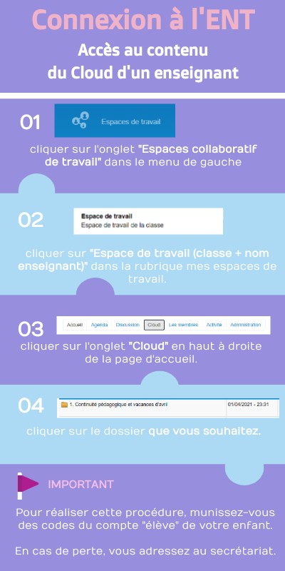 Pour réaliser cette procédure, munissez-vous des codes du compte "élève" de votre enfant. En cas de perte, vous adressez au secrétariat.