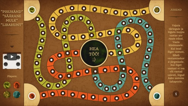 Vajuta täringule ja liiguta nuppu vastav arv ruute edasi. Vasta küsimusele. Kui tead õiget vastust, läheb vastamisekord järgmisele. Kui õiget vastust ei tea või vastad valesti, liigud kaks sammu tahapoole.