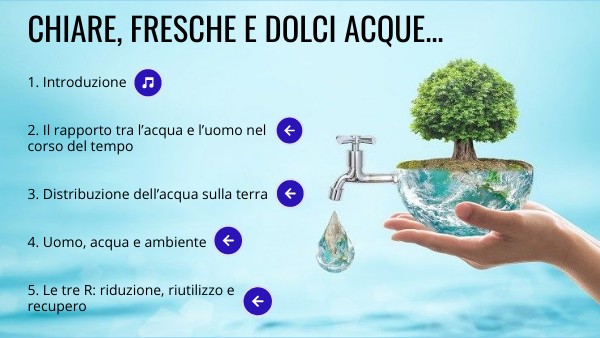 1. Introduzione 2. Il rapporto tra l’acqua e l’uomo nel corso del tempo 3. Distribuzione dell’acqua sulla terra 4. Uomo, acqua e ambiente 5. Le tre R: riduzione, riutilizzo e recupero